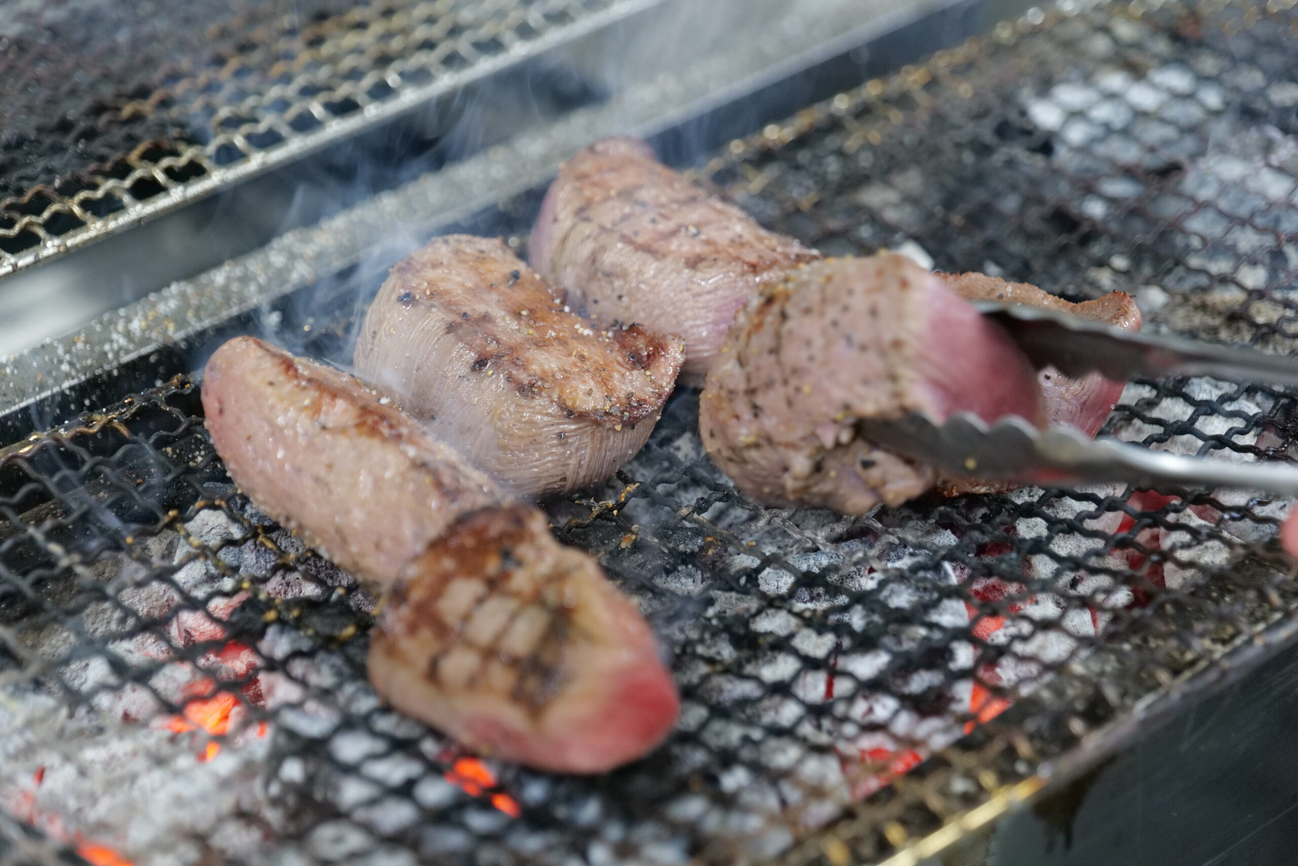 目の前はオープンキッチン。職人が一枚一枚手切りした2cm超の厚切り牛タンを炭火で焼き上げる様子を、最も近い距離で楽しめる席です。炭火でジュワッと焼ける音、立ち上る香ばしい薫香、表面が焼き固まっていく様子——この臨場感をフルに受け取れるのは、カウンター席に座ったときだけです。