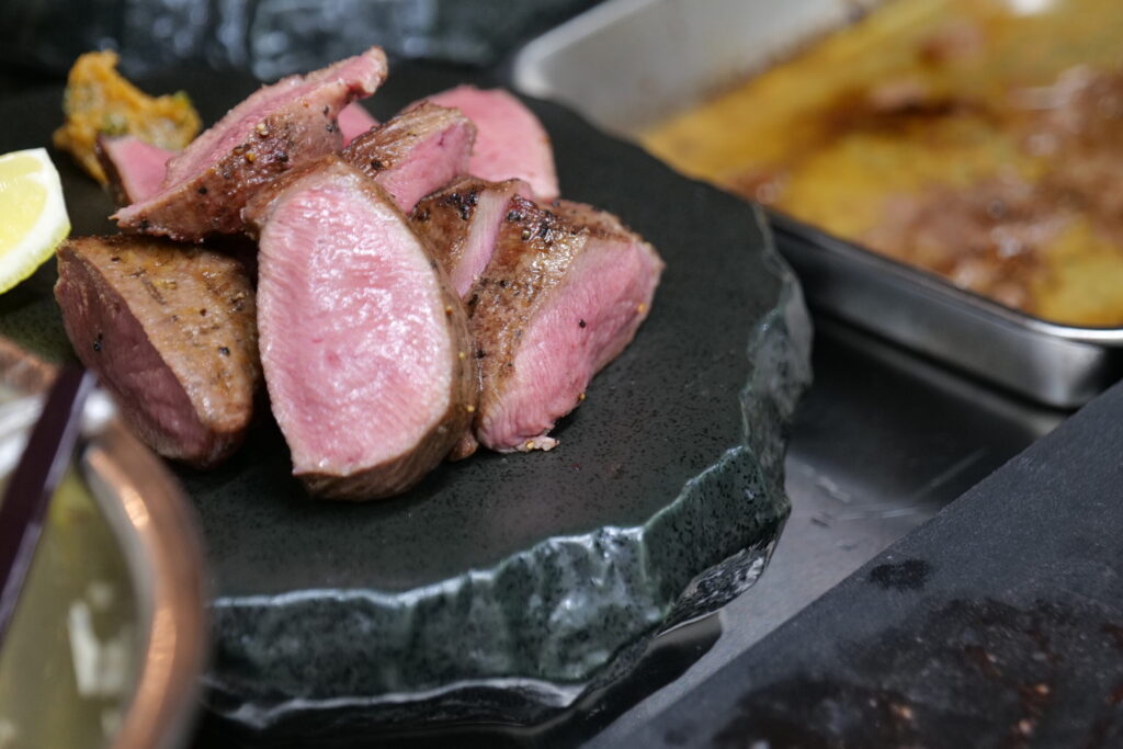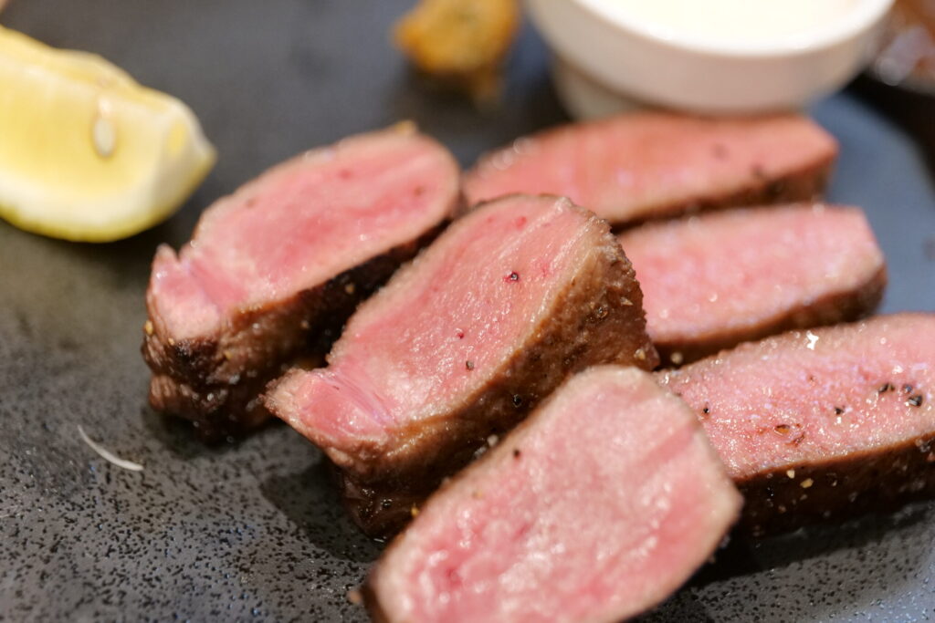 もうステーキです。断面から旨味と肉汁がたっぷりなのを感じれます。炭火で焼かれた表面がきれいな焼き色になっています。